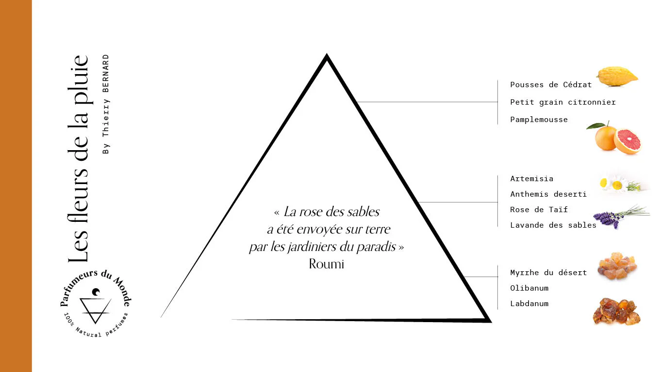 Les Fleurs de la Pluie este o odă delicată dedicată vieții care înflorește acolo unde nimic nu pare posibil. Un parfum rar, cu suflet mistic, născut din nisip, apă și lumină.