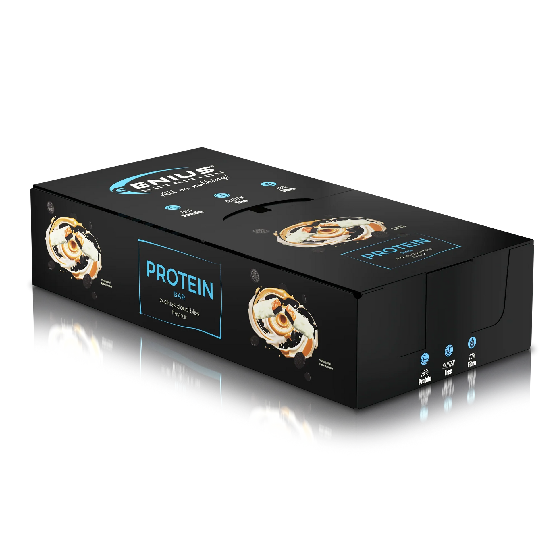 Pasta cu aroma de caramel 25% (fructo-oligozaharide, pudra de lapte integral, apa, unt de cacao, ulei de floarea-soarelui, umectant (glicerol), aroma, emulsificator (lecitine), sare), invelis alb cu maltitol si proteina 25% (indulcitor (maltitol), ulei de rapita hidrogenat si ulei de cocos hidrogenat, pudra de zer dulce, pudra de lapte degresat, concentrat proteic din lapte, emulsificator (lecitine), aroma), amestec proteic 21% (concentrat proteic din lapte, peptide de colagen hidrolizat, proteina din soia, pudra de lapte integral), arahide prajite 10%, indulcitor (maltitol), umectant (glicerol), ulei de rapita, apa, extrudate de proteina din soia (proteina din soia, amidon de tapioca, sare), cocos razuit, colorant (carbon vegetal), arome, agent de ingrosare (guma arabica), emulsificator (mono- si digliceride ale acizilor grasi), antioxidant (extract bogat in tocoferoli).