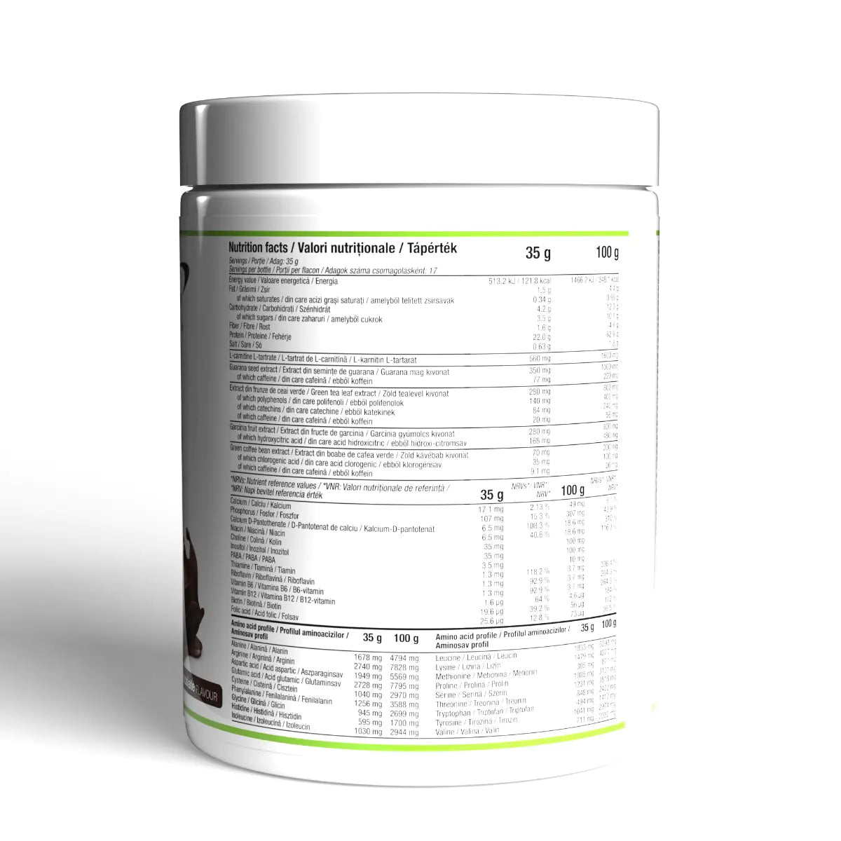 Izolat proteic din soia, pulbere organică de mazăre, isomaltuloză (Palatinose™ - IG 32), cacao cu conținut redus de grăsimi, pulbere organică din semințe de cânepă, pulbere organică de orez, îndulcitori naturali (eritritol, steviol glicozide), L-tartrat de L-carnitină, arome, extract din semințe de guarana (Guarana Paullinia cupana Kunth, 22% cafeină), extract din frunze de ceai verde (Camellia sinensis, 50% polifenoli, 30% catechine, 7% cafeină), extract din fructe de garcinia (Garcinia Cambogia, 60% acid hidroxicitric), complex de vitamine B (inozitol, bitartrat de colină, D-pantotenat de calciu, nicotinamidă, acid para aminobenzoic, ciancobalamină, mononitrat de tiamină, riboflavină, clorhidrat de piridoxină, acid pteroilmonoglutamic, D-biotină), extract din boabe de cafea verde (Coffea Arabica L., 50% acid clorogenic, 13% cafeină), crom picolinat.