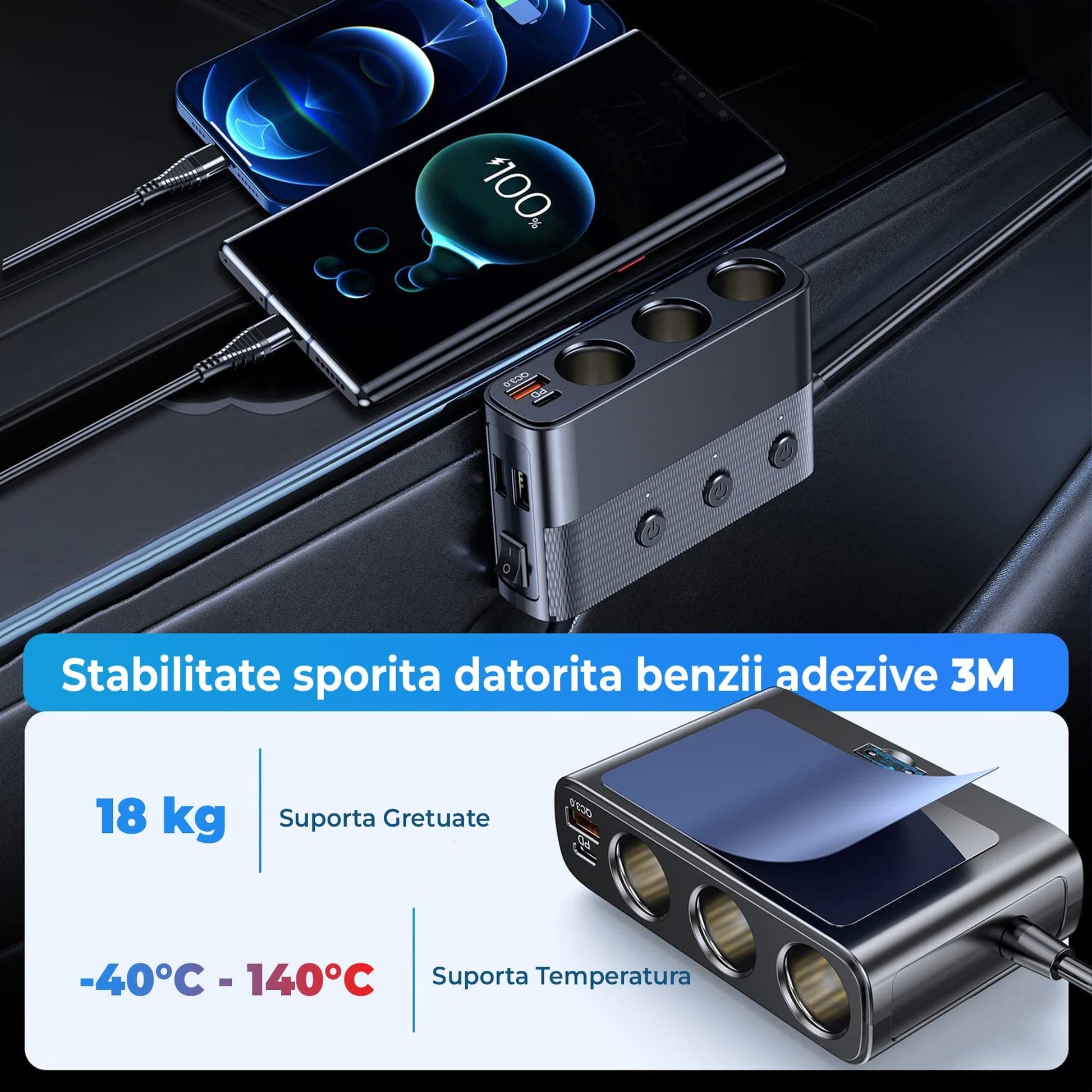 - Functionalitate 7 in 1: Dispune de 3 socluri auto pentru conectarea mai multor aparate, 3 porturi USB cu tehnologie Quick Charge 3.0 pentru incarcare accelerata si 1 port USB-C pentru dispozitivele moderne, oferind o solutie completa pentru nevoile tale de incarcare in masina.