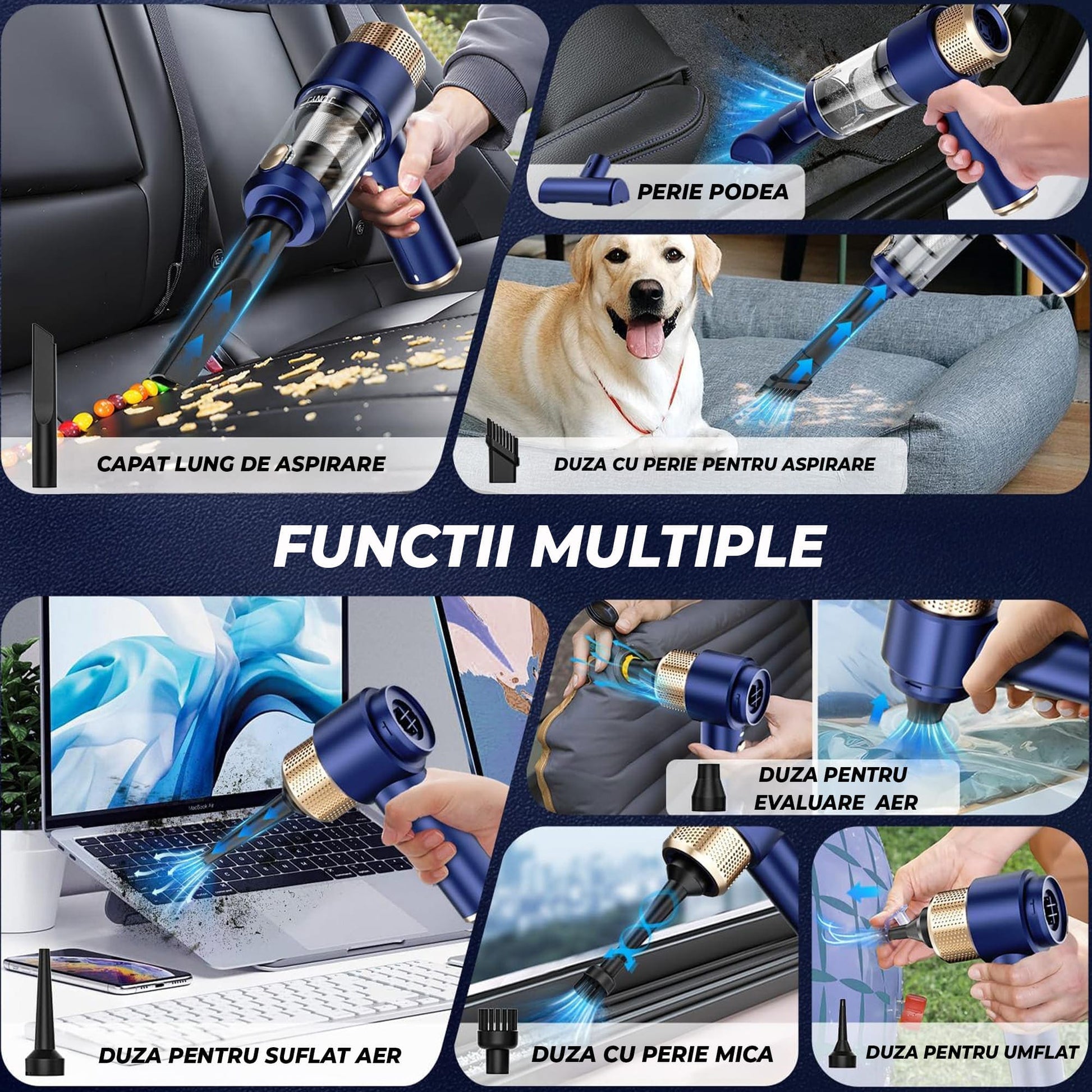 Aspirator Auto Portabil Timebox 2 in 1 – 16000PA, Fara Fir, cu Lumina LED si Accesorii Multiple, Filtru HEPA, Ideal pentru Masina, Acasa sau Birou, Albastru
