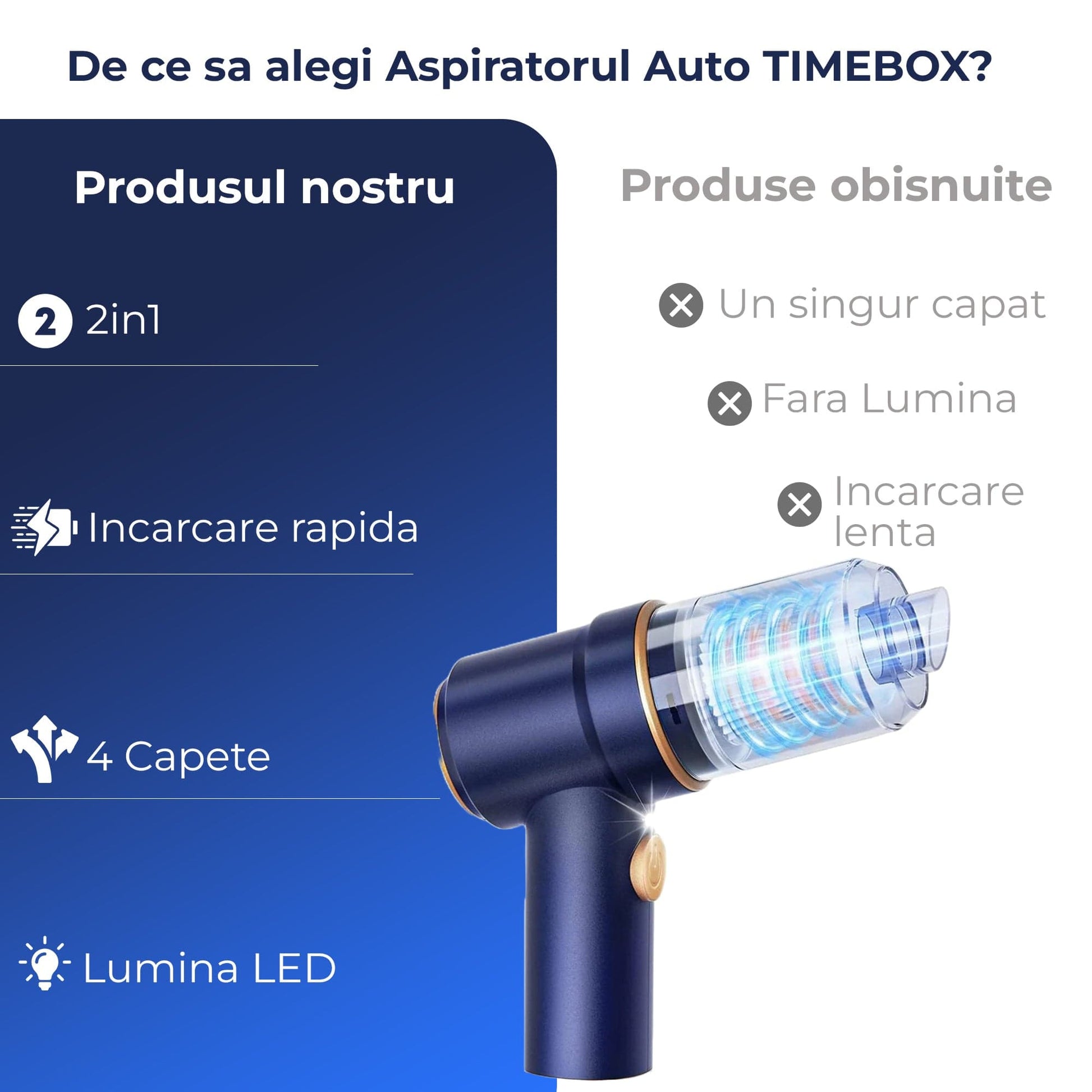 | Beneficiu | Aspirator Auto Timebox | Aspirator Auto obișnuit |