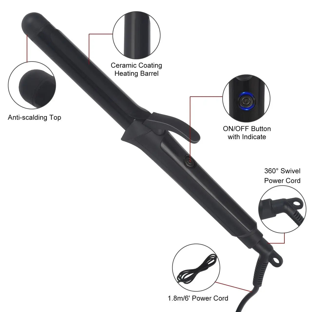 Ondulatorul de păr cu diametru de 25mm și înveliș ceramic asigură bucle netede și strălucitoare, protejând firul de păr împotriva degradării. Dispune de vârf anti-arsură, buton ON/OFF cu indicator luminos, cablu rotativ la 360° pentru manevrare ușoară și un cablu de alimentare lung de 1.8m. Perfect pentru utilizare acasă sau profesional, permite coafarea rapidă, sigură și eficientă, rezultând bucle de lungă durată, fără efect de electrizare.
